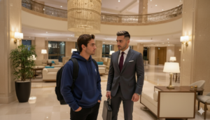 Era Julián. Vestía una sudadera azul marino con capucha, jeans oscuros y una mochila al hombro. Su apariencia era la de un estudiante universitario o un viajero común, alguien que, a simple vista, no encajaba en el opulento entorno del hotel.
