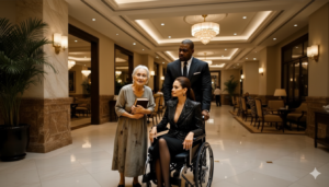 Elena descansaba sobre su lujosa silla de ruedas en el vestíbulo de uno de los hoteles más exclusivos de la ciudad. Vestía un traje de alta costura, negro y brillante, que reflejaba la frialdad de su alma. A su lado, Marcos, su guardaespaldas de confianza, permanecía como una torre de mármol, vigilando que nadie interrumpiera la amarga paz de su jefa.