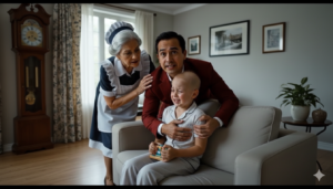 Sentados en el sofá de su hogar, Julián intentaba mantener la compostura. Vestido con su traje color vino, símbolo de su antigua vida de éxitos, se acercó a su hijo. Mateo, con su cabecita calva y vistiendo un pijama blanco impecable, sostenía entre sus manos un pequeño juguete de madera, una casita que su padre le había regalado.