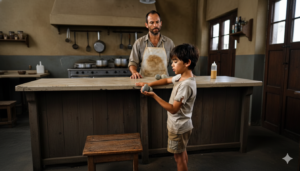 Samuel se detuvo. Miró a Javier y luego al pequeño Leo, quien ya saboreaba un trozo de pan con la inocencia de quien se siente protegido. La respuesta de Samuel fue un puñal de sabiduría para el espectador: