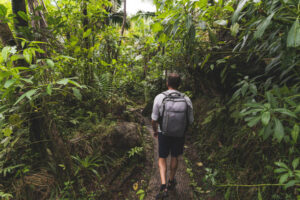 Male hiker with backpack trekking on footpath in tropical rainforest on overcast day in El Yunque Puerto Rico